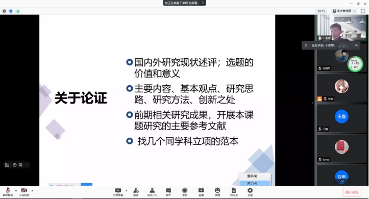 报告会中,于教授首先讲解了项目申报各个类别的区别。然后进一步剖析了关于选题的问题,于教授表示选题来源一定要做到变通,保证一定的前期基础,且要对历年批准立项的课题做一定研究。最后,于教授用自己申报的课题给大家详细的介绍了关于选题、关于论证、关于细节等方面的做法。使大家对于国家社科基金申报有了更加深入的了解。