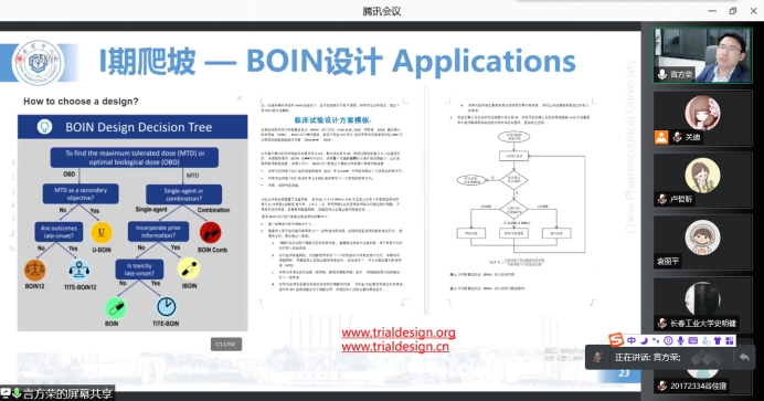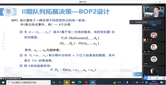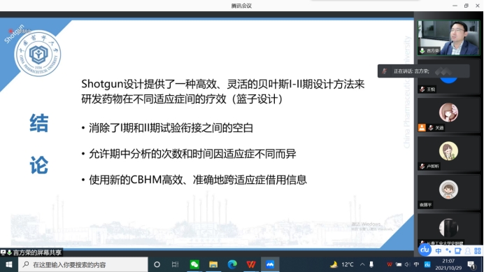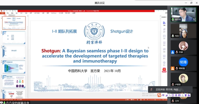 报告会中,言教授引出了基于贝叶斯无缝设计理论,用于加速肿瘤靶向治疗和免疫治疗的研究成果。目前言教授团队针对肿瘤及药物的研究已经到达分子分型层面,提出了相同突变引起的不同部位肿瘤可以“异病同治”的观点,即可以将属于同类突变的肿瘤疾病放到同一个“篮子”里,称为“篮子设计”。Shotgun是基于一种高效、灵活的贝叶斯Ⅰ-Ⅱ期设计方法来研发药物在不同适应症间的疗效,消除了Ⅰ期和Ⅱ期实验衔接之间的空白,允许分析的次数和时间因适应症不同而异,使用新的CBHM高效、准确地跨适应症借用信息。该项理论已经成功应用于部分肿瘤类型的治疗过程并且达到了较为理想的预期。