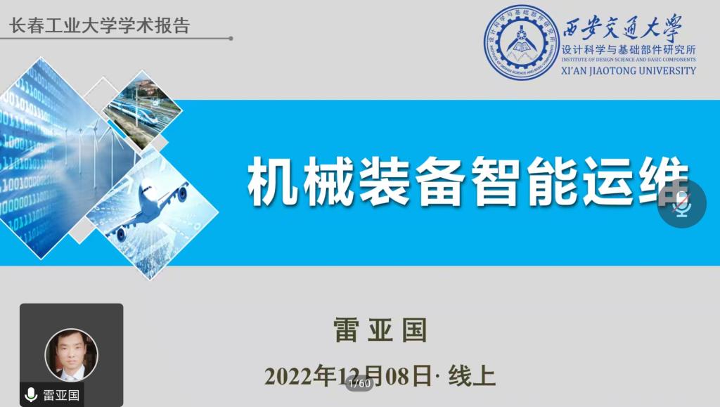 (通讯员:关迪)为丰富学生的学习生活,提高学生的综合能力,2022年12月8日下午19:30,由科研处和yl23411永利集团承办的“机械装备智能运维”在腾讯会议线上举行,特邀西安交通大学雷亚国教授做报告,为我校师生进行讲解,yl23411永利集团院长王纯杰、副院长李纯净、统计系主任杨凯、学院部分老师,本科及研究生共215人参加本次线上学术报告,报告由院长王纯杰主持。