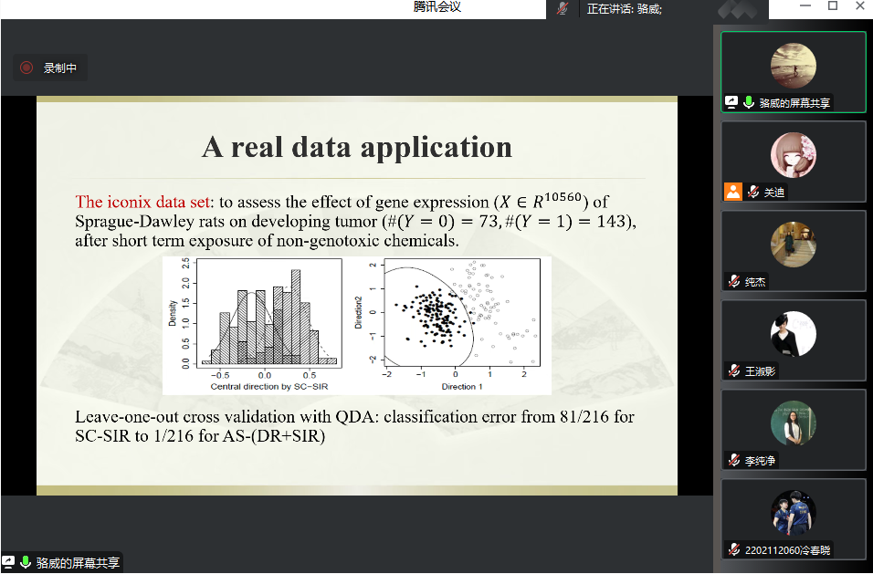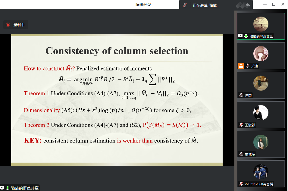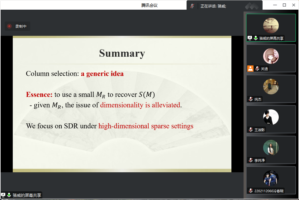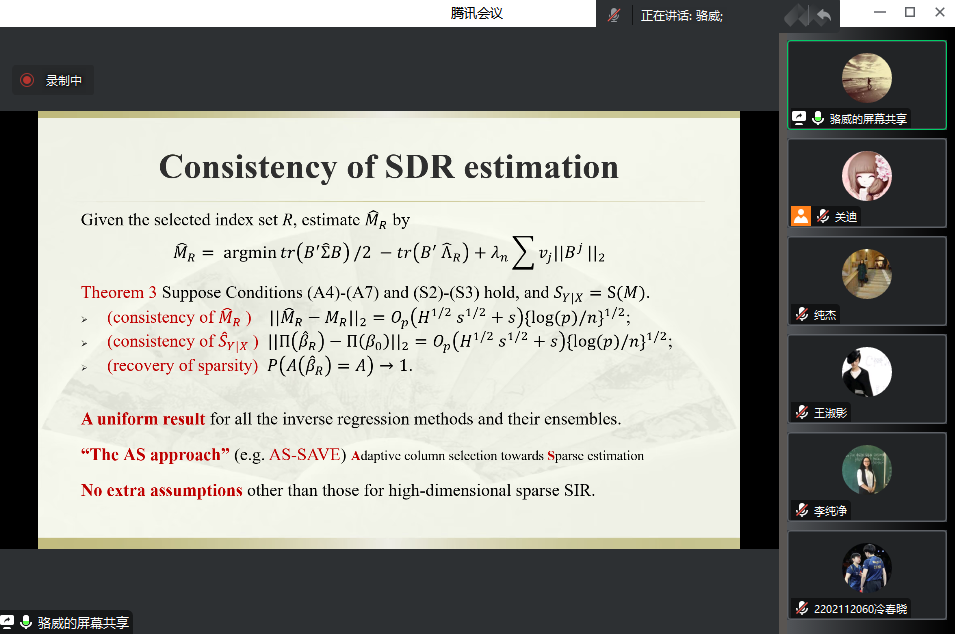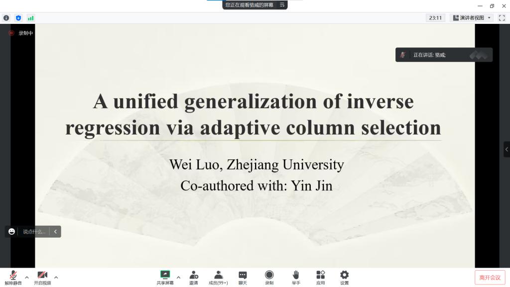 (通讯员:关迪)为了扩展学生的专业思维,提升专业知识的理论学习水平,2023年3月29日上午10:00,由yl23411永利集团主办的报告——“A unified generalization of inverseregression via adaptive column selection”在腾讯会议线上举行,特别邀请骆威老师作为主讲人,基于骆威老师本人的研究以及工作经历,为我校师生进行讲解,我院共有160多名师生前来参会讨论与学习。我院yl23411永利集团院长王纯杰、副院长李纯净、统计系主任杨凯、统计系副主任王淑影等学院部分老师、研究生参加了本次学术报告会,会议由yl23411永利集团院长主持。