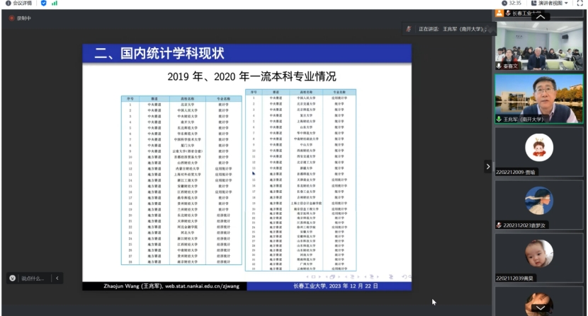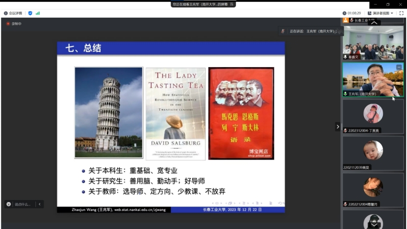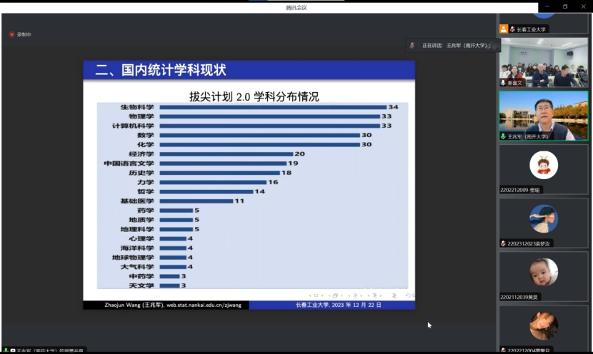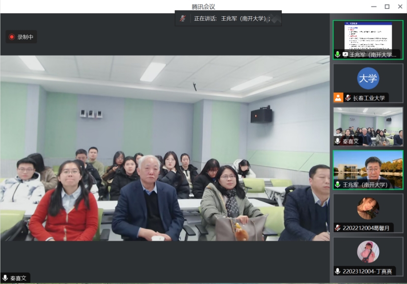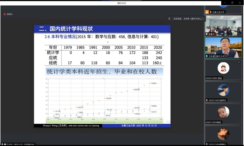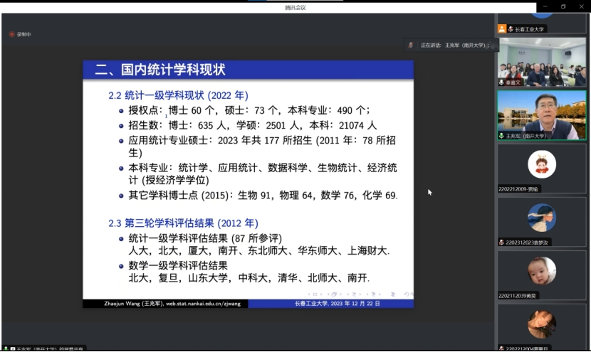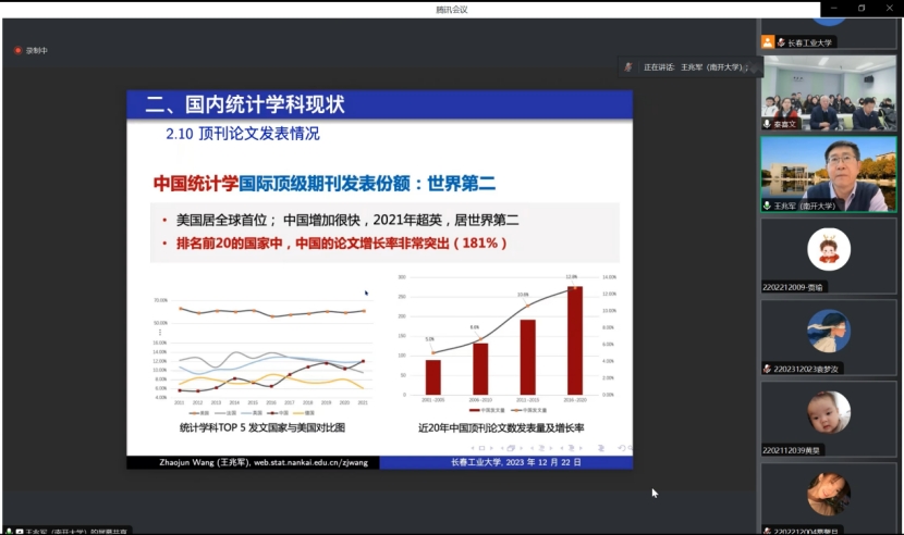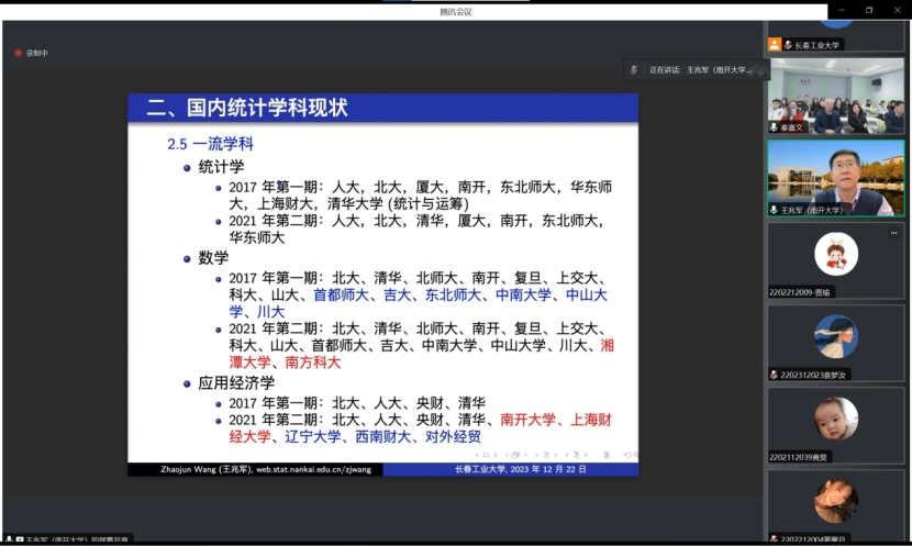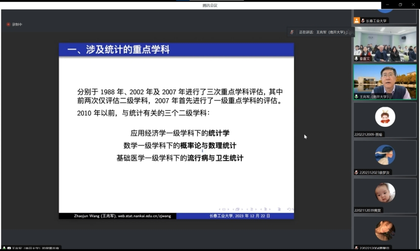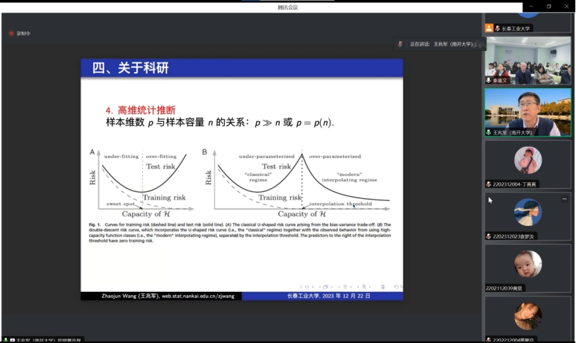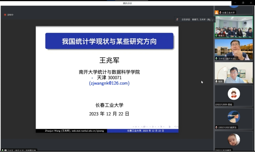 (通讯员:关迪)2023年12月22日9:00 ,南开大学王兆军教授为我院做线上学术报告,学校副校长林洁琼教授、校学术委员会副主任董小刚教授、yl23411永利集团院长王纯杰教授、yl23411永利集团副院长李纯净副教授、yl23411永利集团副院长杨凯副教授、yl23411永利集团统计系主任王淑影副教授以及学院部分老师、研究生参加了本次线上学术报告会。会议由大数据科学研究院院长兼学科建设办公室副主任秦喜文教授主持。