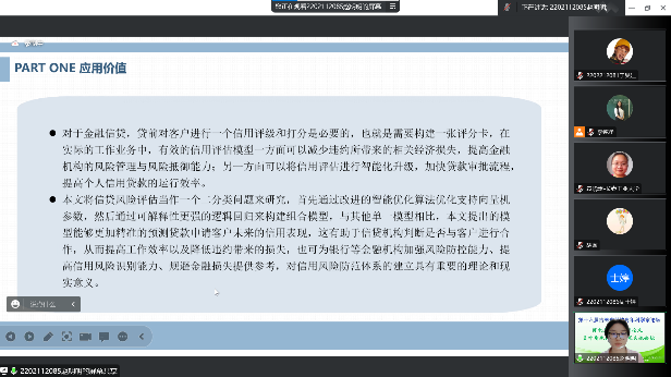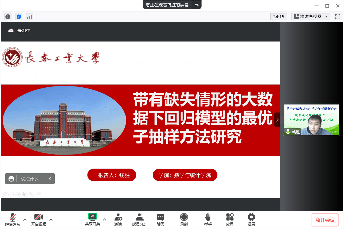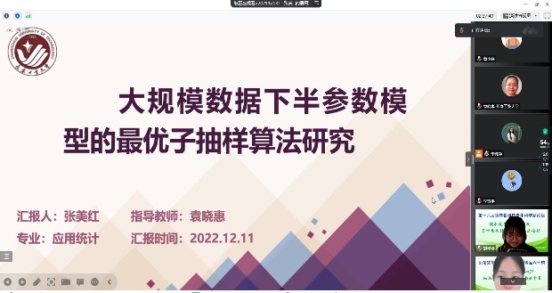 主论坛上,李勇理事长代表学会对论坛的举办表示由衷祝贺,高度评价了yl23411永利集团近年来快速发展的良好态势,表达了学会对本次论坛的大力支持和高度重视。在各位青年学者进行汇报之前,各位专家开展了热烈讨论交流并进行云合影。分论坛共邀请了23位青年学者进行学术报告,报告分为3个专题,汇报的研究方向有函数型数据研究、贝叶斯统计分析、其他模型与算法的研究等。青年学者积极开展学术报告,各位与会专家、学院院长王纯杰和统计系主任杨凯分别为青年学者进行点评。