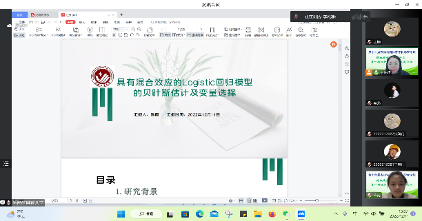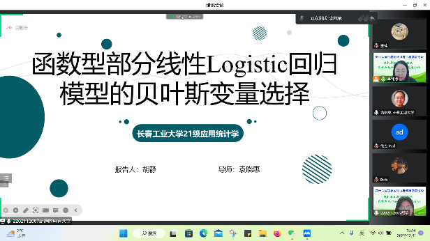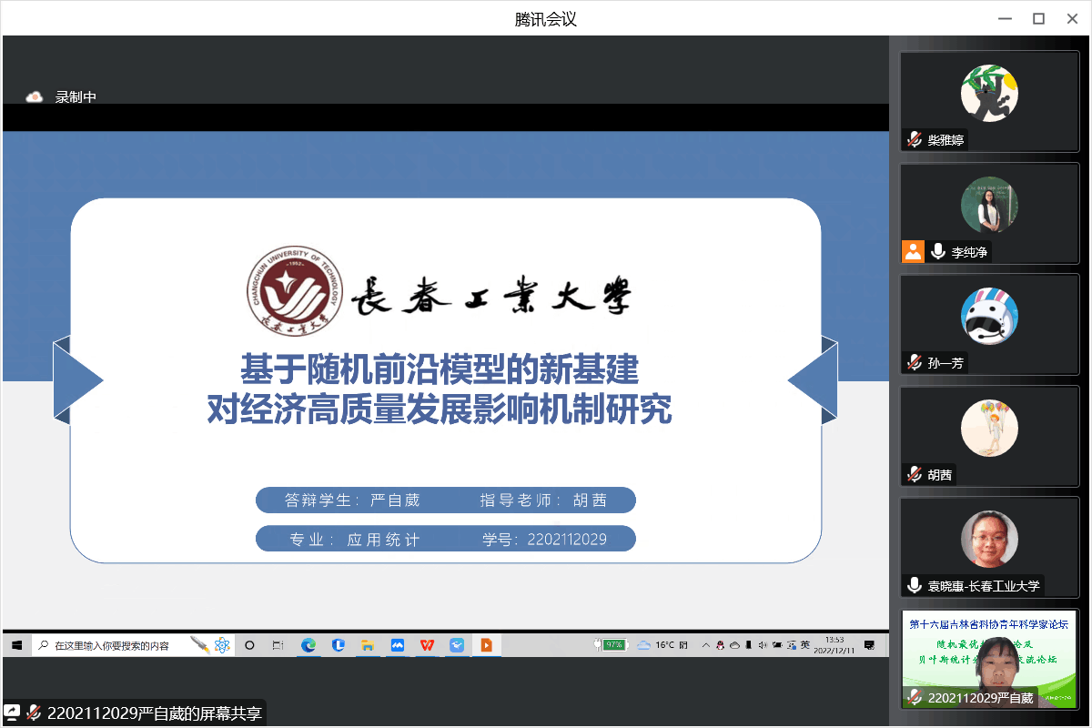 【通讯员 胡茜】2022年12月11日,上午9:30,由吉林省工业与应用数学学会主办,永利官网协办的“第十六届吉林省科协青年科学家论坛-随机最优控制及贝叶斯统计分析析学术交流论坛”在腾讯会议线上举行。主论坛特别邀请吉林省工业与应用数学学会李勇理事长、东北师范大学郑术蓉教授、吉林大学韩月才教授、吉林大学辛本禄教授、暨南大学王国长教授、北华大学谭希丽教授、吉林大学李天宇副教授、西安交通大学付利亚副教授、闽南师范大学吕阳阳老师、北华大学张继超老师。本次论坛由学院副院长李纯净主持,学院院长王纯杰、统计系主任杨凯、统计系党支部书记袁晓惠、统计系教师孙一芳、李贺宇、胡茜以及部分研究生参加了本次线上青年科学家论坛。