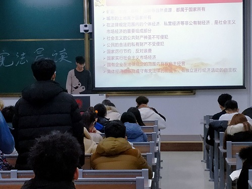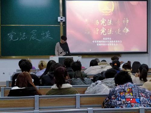 yl23411永利集团团委讯(通讯员:李佳鑫 陈铭)为深入开展宪法学习宣传教育活动,进一步增强学生法律意识,弘扬宪法精神。yl23411永利集团于2020年12月7日在主楼124教室举行“宪法晨读”活动,2019、2020级全体班委及学院团学组织成员参加,本次活动由团委组织部思想引领中心副主任朱爱成主持。