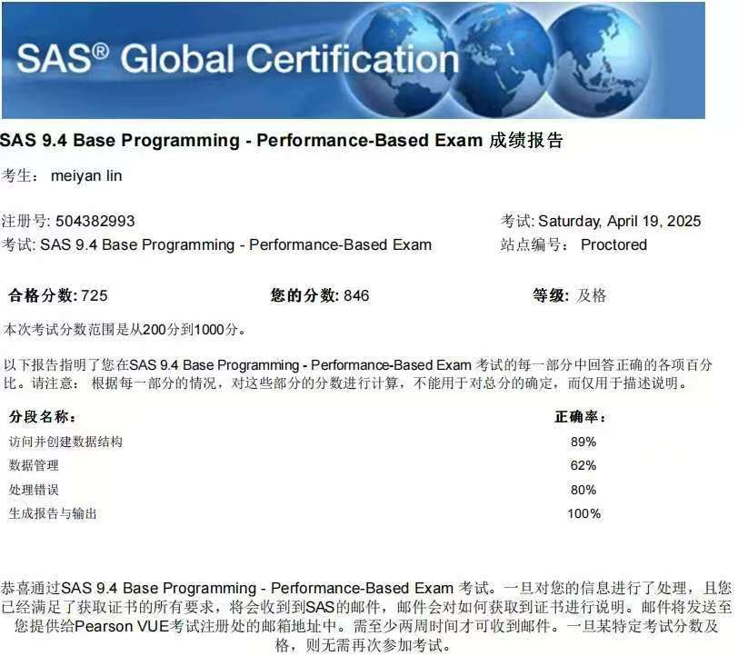 此外,在决赛期间,由SAS公司提供的免费北美SAS认证考试中,李相楠、林美嫣、郭子明、郭颖四位同学一次性通过认证。