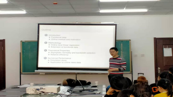 报告会中,姚方教授讲解了功能数据的在线估计的一种在线动态更新函数数据均值和协变函数局部线性估计的新方法,提出用一个动态的候选序列来逼近未来的最佳带宽,并结合相应的跨块统计数据来做出更新的估计,该方法易于在线计算。随后,介绍了利用仿真和实际数据应用来彰显该方法的优点,使大家对于功能数据的在线估计有了更加深入的了解和兴趣。其中姚方教授还细心的为大家介绍几本有关这些知识的一些未来瞻仰。