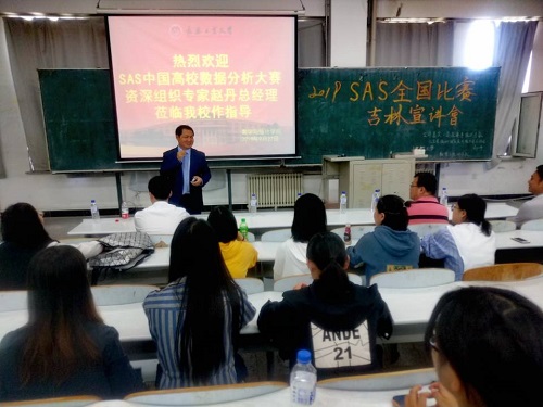 yl23411永利集团团委讯(通讯员:李龙章 桂尚珂)为了让统计学的同学们深入了解SAS软件在学习与日后工作中的重要性,让同学们积极参加接下来的“扬子江新金融杯”2019 SAS (中国)高校数据分析大赛暨首届国际邀请赛,2019年9月27日,yl23411永利集团荣邀SAS中国高校数据分析大赛资深组织专家赵丹总经理及其团队莅临我院,并于下午13点,在教图楼701教室做2019SAS全国比赛吉林宣讲会。yl23411永利集团党委书记朱宏伟、副院长徐平峰、统计系主任李纯净、部分教师代表及统计学专业的硕士研究生和本科生参加了此次宣讲会,会议由学院党委书记朱宏伟主持。
