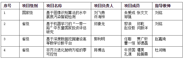 根据《关于做好2021年吉林省大学生创新创业训练计划立项申报和国家级项目推荐工作的通知》(吉教高(2021)15号)要求,经学院初评,学校遴选,省教育厅和教育部高等教育司审定,确定2021年度由我院教师指导的大学生创新创业训练计划项目获得1项国家级项目立项和3项省级项目立项,具体名单如下: