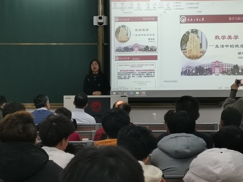 yl23411永利集团团委讯(通讯员:柳笛 陈铭)为了让同学们深入领略数学之魅力,积极探索数学的奥秘,yl23411永利集团邰志艳教授于2020年12月16日10:10在北湖东区主楼220教室为我院师生作以“数学美学——生活中的数学之美”为内容的学术报告,出席本次报告会的有校教育处副处长杜鹃、校美育中心副主任山川、学院党委书记朱宏伟、院长王纯杰、副院长刘铭,教师代表白琪峰、张建影、黎海彤老师及2019级和2020级全体学生。