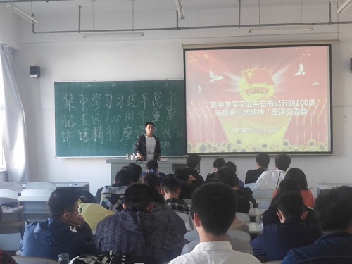 本次座谈交流会由各班级团支书着重为同学们讲解了关于习近平总书记重要讲话精神的精炼部分。在大会上,习近平总书记强调五四运动是以全民族的力量高举起爱国主义的伟大旗帜,以全民族的行动激发了追求真理、追求进步的伟大觉醒,以全民族的搏击培育了永久奋斗的伟大传统,由此可见中国青年始终是实现中华民族伟大复兴的先锋力量。各班级团支书着重讲解“新时代中国青年运动的主题”和“新时代中国青年的使命”两部分。习近平总书记对党的青年工作提出要求:“要主动走近青年、倾听青年,做青年朋友的知心人,要真情关心青年、关爱青年,做青年工作的热心人,要悉心教育青年、引导青年,做青年群众的引路人。”最后,170801班虎佳尧代表发言:“我们要有理想,树立远大理想,热爱祖国;有本领,勇于奋斗、品德高尚的新时代优秀青年;有担当、为中华民族伟大复兴铺路,为祖国建设添砖加瓦。”